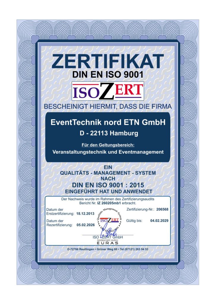 Qualitätsmanagement bedeutet für uns, dass wir einen sehr hohen Anspruch an unsere Produkte und Dienstleistungen haben und diese permanent auf den Prüfstand stellen und kontinuierlich weiterentwickeln. Damit sind wir Ihr zuverlässiger Eventpartner in allen Bereichen des Veranstaltungssektors.
